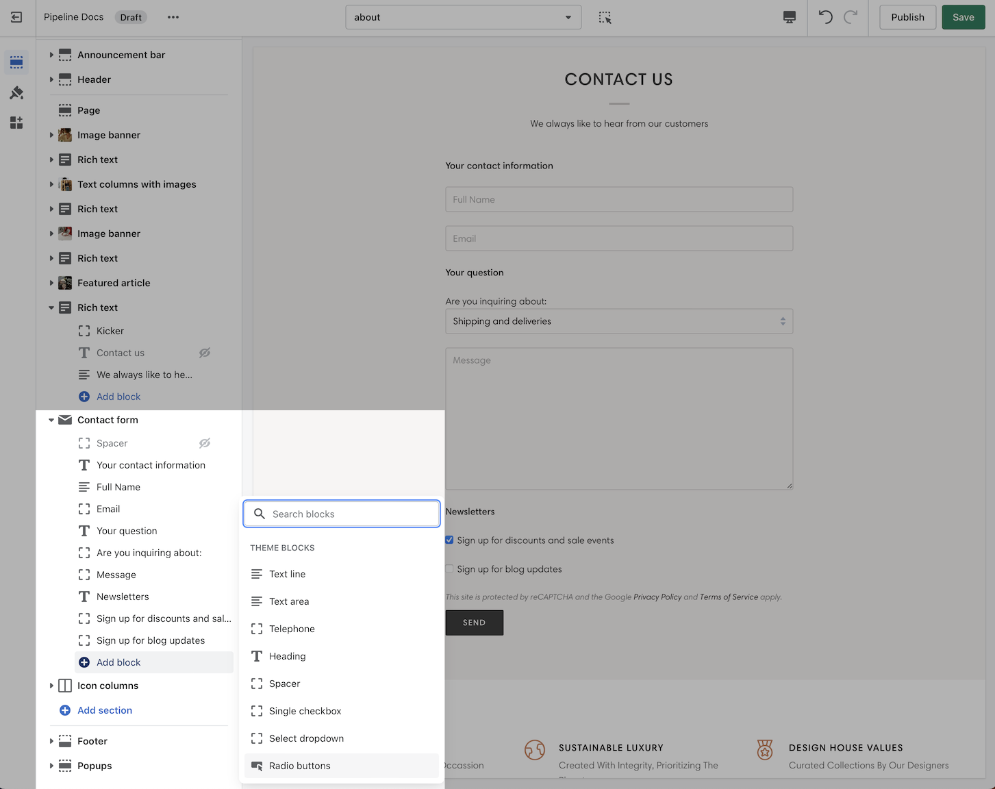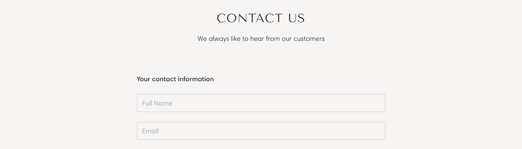 Build a simple or completely custom contact form with this section that includes blocks of many types of form elements. Add the section to any Page, Product detail pages, the homepage, blog posts, search, the 404 page, and more: