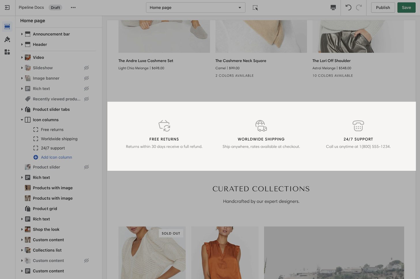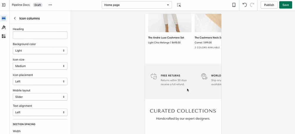 Use the section settings to design the layout style, icon size, and icon placement: