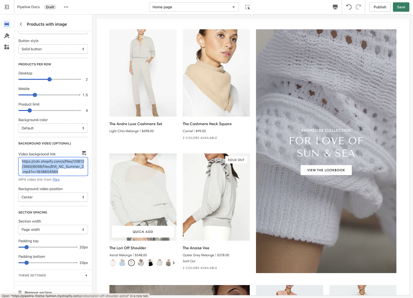 Display an optional MP4 looping video by choosing the URL of a video from your Shopify files library:
