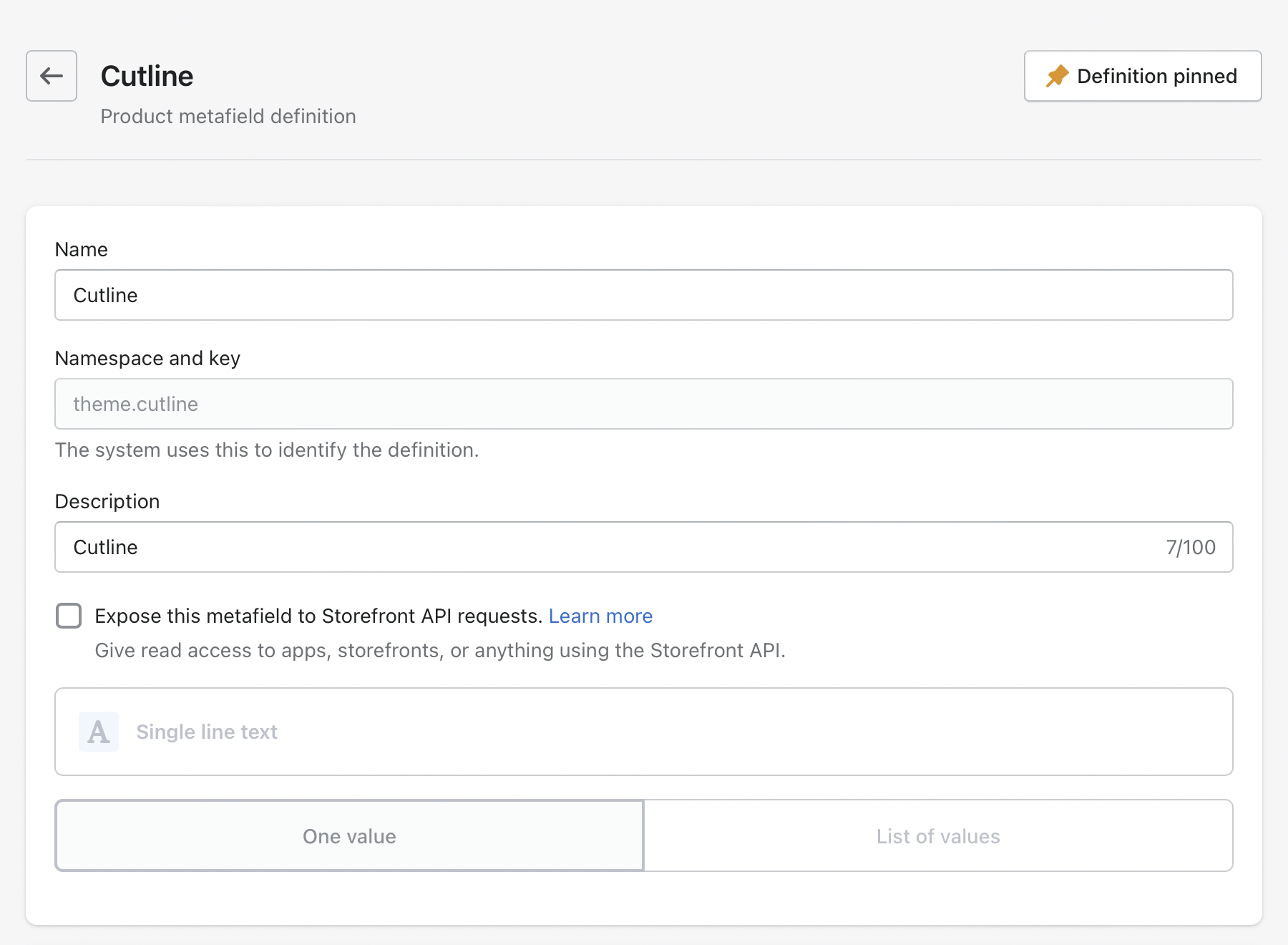 The content type is Single line text and the value is One value.
