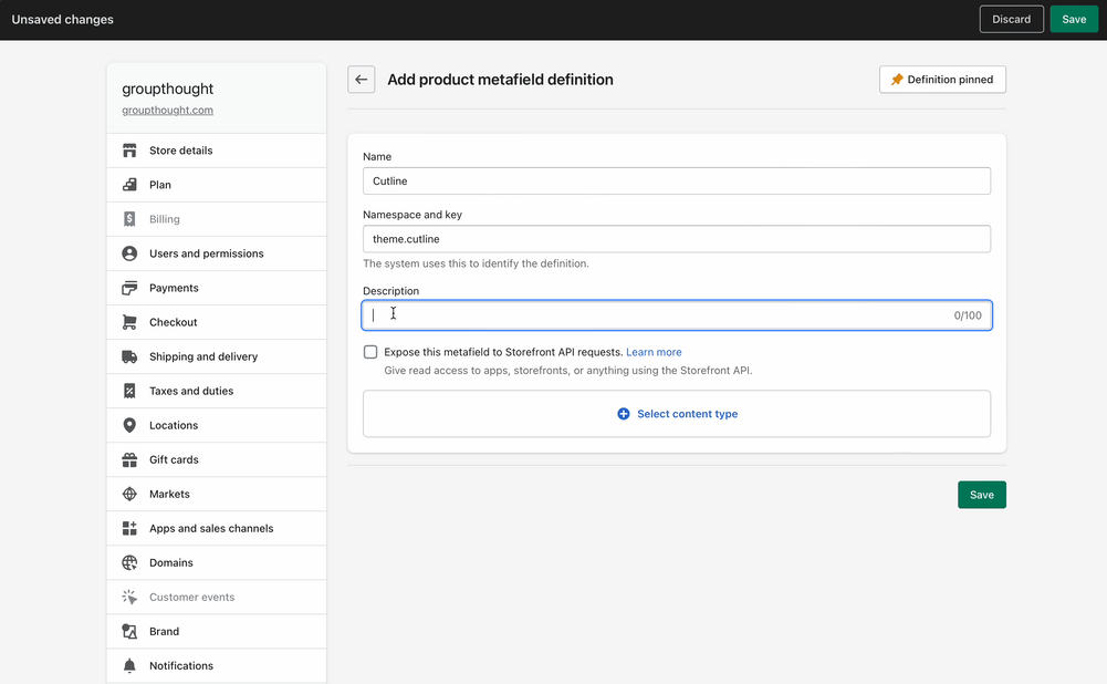 Start by defining a Products metafield and name it Cutline.Then change the Namespace from custom to theme: