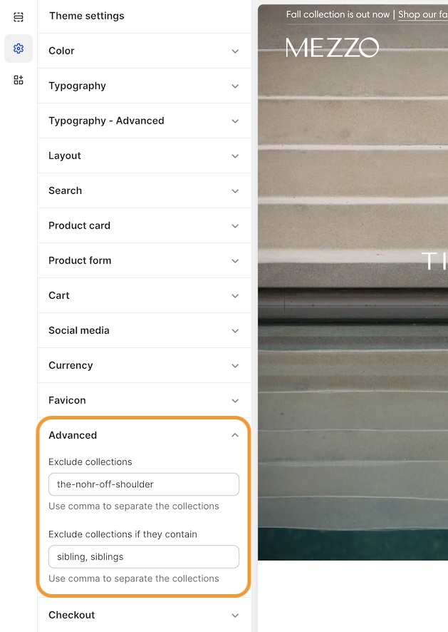 * Next, add the collection to the search exclusion list in the Theme settings -> Advanced.&#x20;