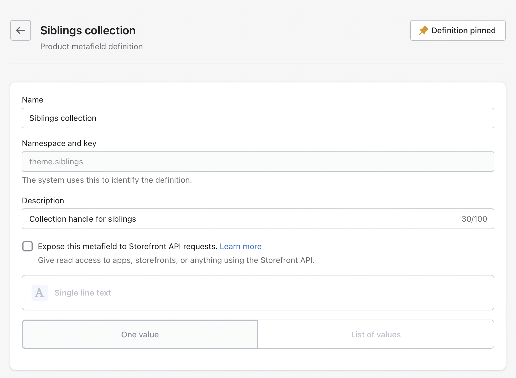 Start by defining a Products metafield and name it Siblings collection.Then change the Namespace from custom to theme and the key to simply siblings.